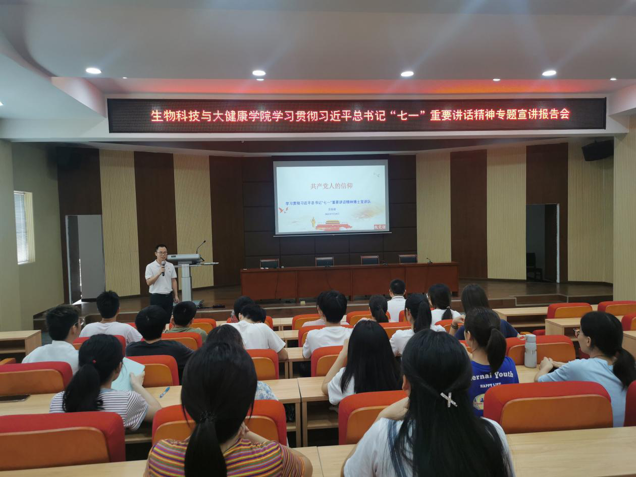為興起學習貫徹習近平總書記“七一”重要講話精神的熱潮,引導學生黨員加深對“七一”重要講話精神的理解和把握,7月15日生物科技與大健康學院在馬蘭芳樓307室舉辦學習貫徹習近平總書記“七一”重要講話精神專題宣講報告會,由博士宣講隊成員吳盼盼老師為學院學生黨員作題為《共產黨人的信仰》宣講報告。學院黨委書記許皓、本科生黨員共計32人參加了宣講會。