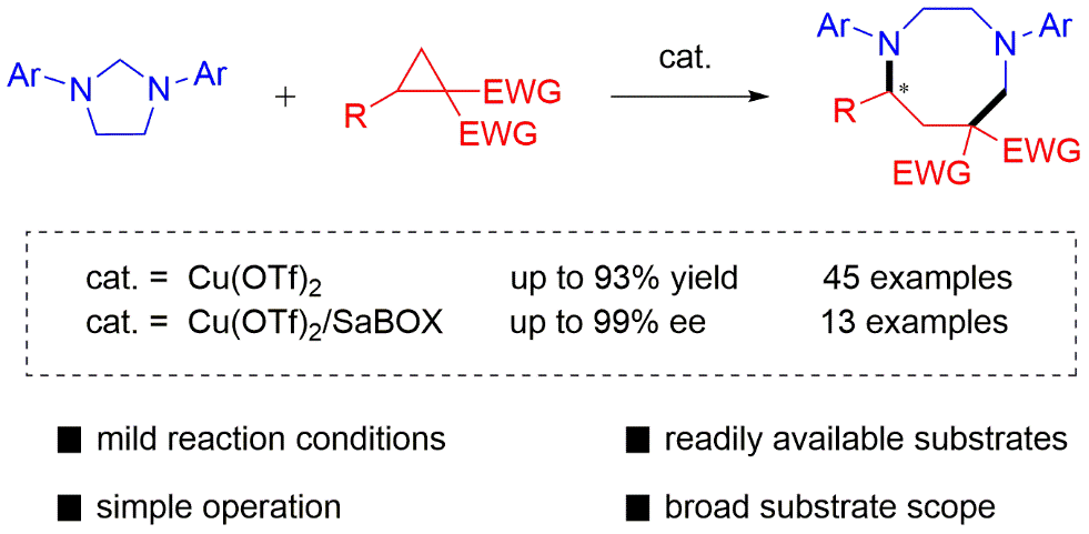 該工作根據前期研究成果(Org. Lett. 2022, 24, 6443?6448;ACS Catal. 2022, 12, 14647?14653),發展了一種銅催化的DAC與咪唑啉的(5 + 3)環加成反應,在溫和條件下以中等至優異的產率得到了一系列飽和的1,4-二氮雜辛烷化合物。進一步通過手性轉移(Chirality Transfer)和動態動力學不對稱轉化(Dynamic Kinetic Asymmetric Transformation)兩種策略,首次實現了1,4-二氮雜辛烷的不對稱合成。