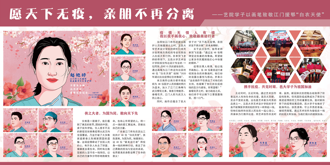 2020年,藝術學子充分發揮專業優勢,以實際行動助力抗“疫”。在黃驍帶領下,師生團隊與企業聯合設計的“醫療凈化隔離病床”被廣州市黃埔區工業和信息化局列為當前防疫急需物資。在單賀飛老師帶領下,學生們為馳援湖北的48位醫護人員制作“2020年湖北抗擊疫情”紀念肖像畫,向每一位醫護人員贈送了溫情的禮物。2019級視覺傳達設計專業的劉沁沁設計的“天醫拱照、中國加油”作品,被團市委采納,印在江門團市委送給武漢的物資上。2019級產品設計專業的謝芊蕓創作的《活動中暑暈倒——書畫致敬》作品,被省學聯采納并進行推送,致敬抗疫一線英雄。為引導廣大師生進行科學防控、居家健身,舞蹈系發起“‘藝’起戰疫·舞蹈系在行動”原創舞蹈作品創作活動。